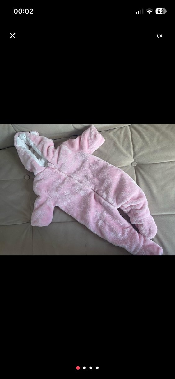 Pastel pembe renkte, kapüşonlu ve kürk detaylı yumuşak bebek tulumu, bebeğinizi sıcak tutar.