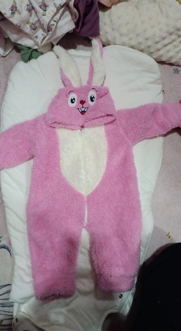Kapüşonlu, kürklü ve sevimli tavşan kulaklı pembe bebek tulumu, yumuşak ve sıcak dokusu ile rahatlık sağlar.