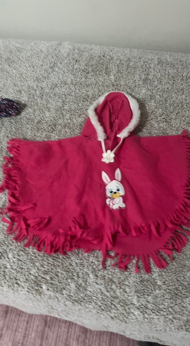 Renkli pembe panço, uzun kollu ve kapüşonlu, yumuşak kürk detaylı. Nakışlı tavşan ve püsküllü kenarlarıyla bohem tarzda.