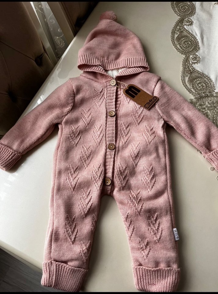 Pastel pembe renkte, kapüşonlu ve düğmeli kapamalı örgü bebek tulumu, bebeğiniz için sıcaklık ve konfor sağlar.