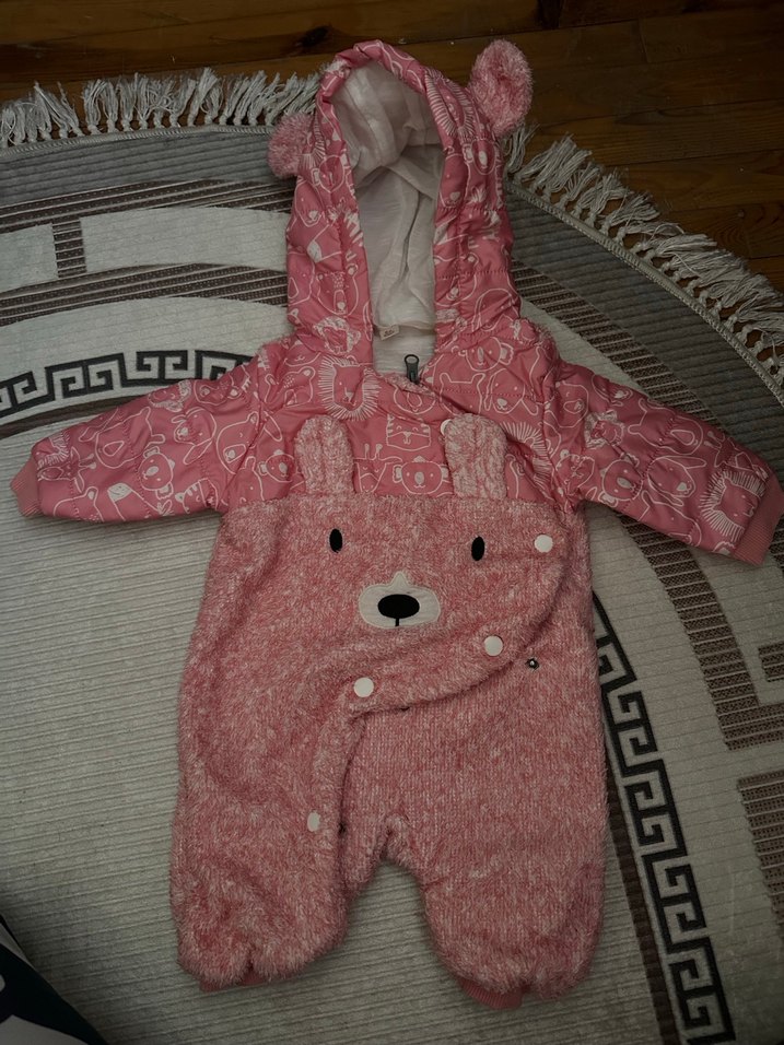 Pastel pembe renkli, kapüşonlu bebek tulumu, örgü alt kısmı ayı yüzü desenli ve baskılı üst kısmı ile dikkat çekiyor.