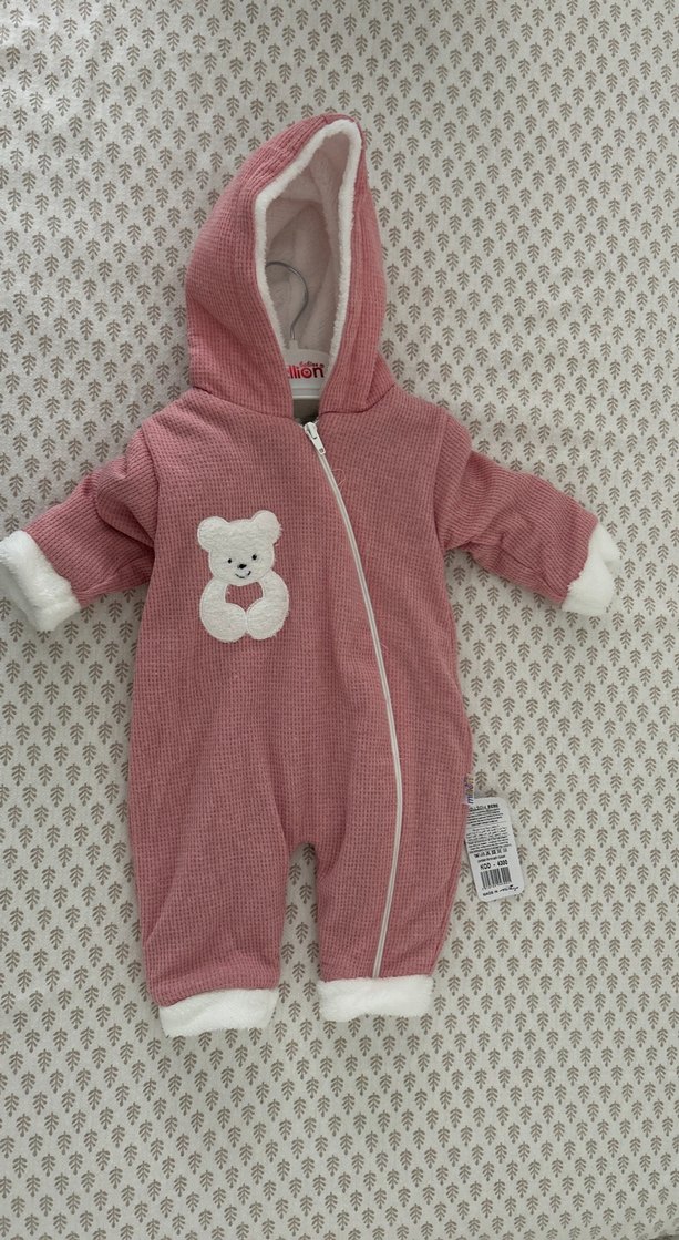Pembe örgü kız bebek tulumu, kapüşonlu ve renkli nakışlı ayıcık desenlidir. Ön fermuarlı ve yumuşak manşetlidir. ❄️ Hediye geldi kullanılmadı