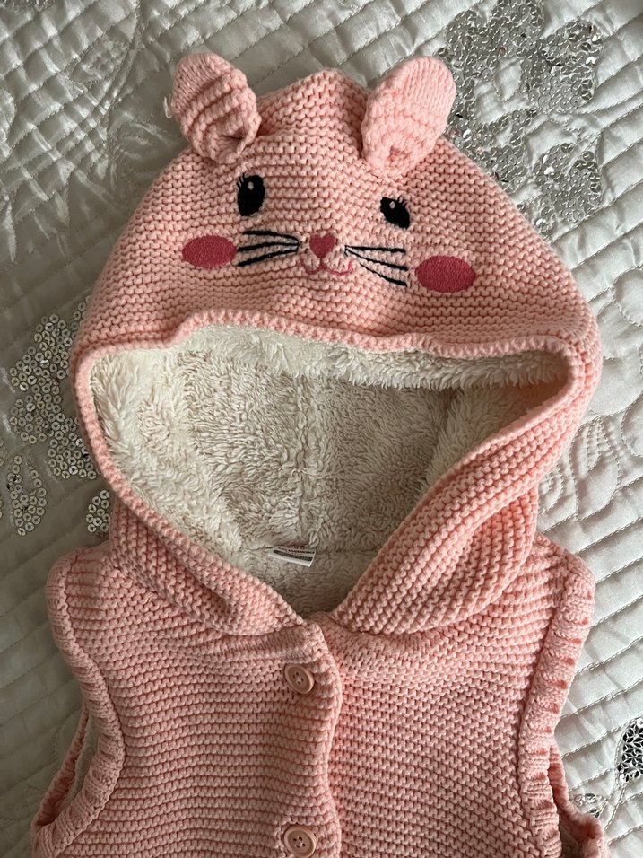 Pastel pembe renkli, örgü kumaştan yapılmış, kapüşonlu ve nakışlı hayvan yüzü detaylı, kolsuz, vücuda oturan kız çocuk yeleği.