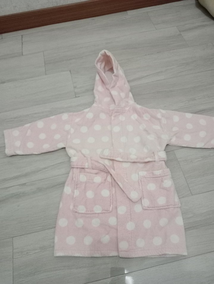 Yumuşak ve sıcak kumaştan yapılmış, kapüşonlu kız bornozu. Pastel pembe renk ve beyaz puantiyelerle süslenmiştir. Ön cepleri ve kemeri vardır.