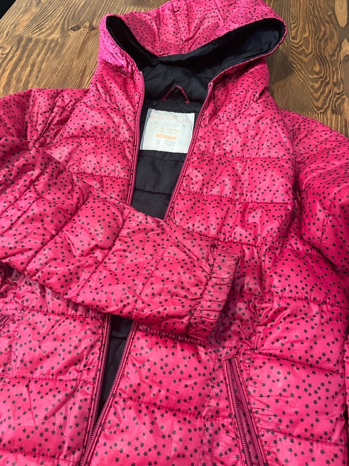 Çok uygun fiyatlı!!Defosuz kapüşonlu, fermuarlı, pembe puantiyeli ve sentetik kumaş mont. Renkli ve çok konforlu rahattır.