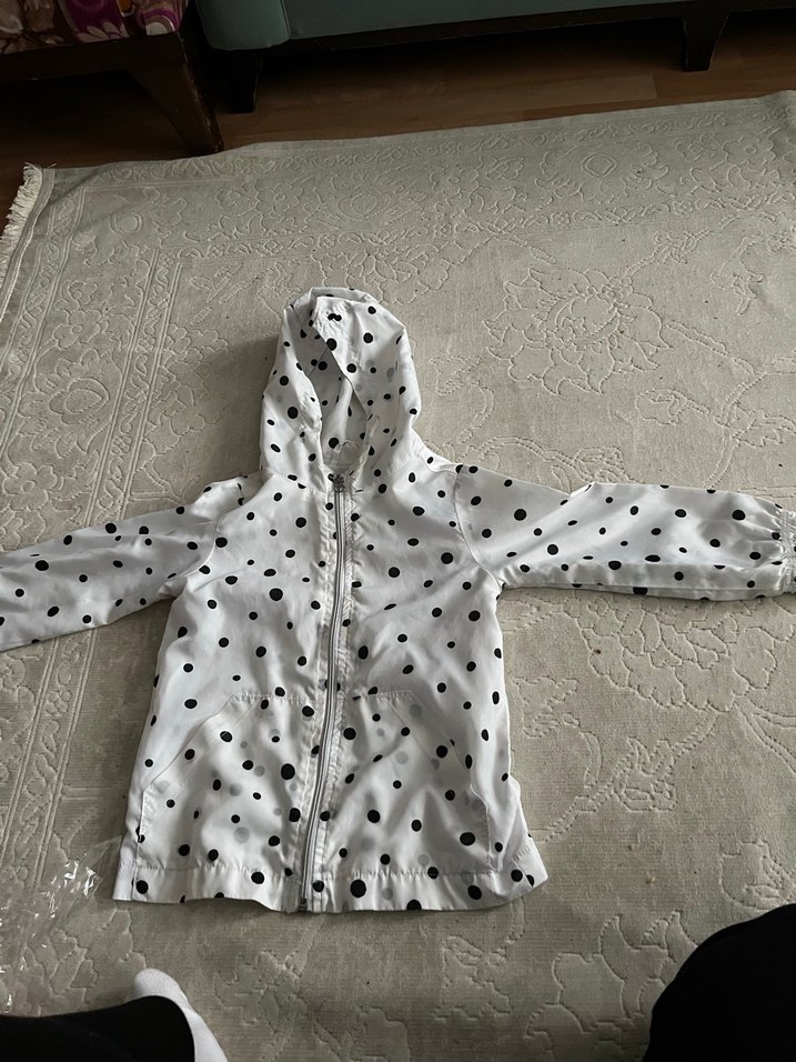 Kapüşonlu, fermuarlı ve vücuda oturan kız çocuk yağmurluğu. Yumuşak ve sıcak kumaştan, beyaz zemin üzerinde siyah puantiyeli desende, sokak stili için uygun. ️