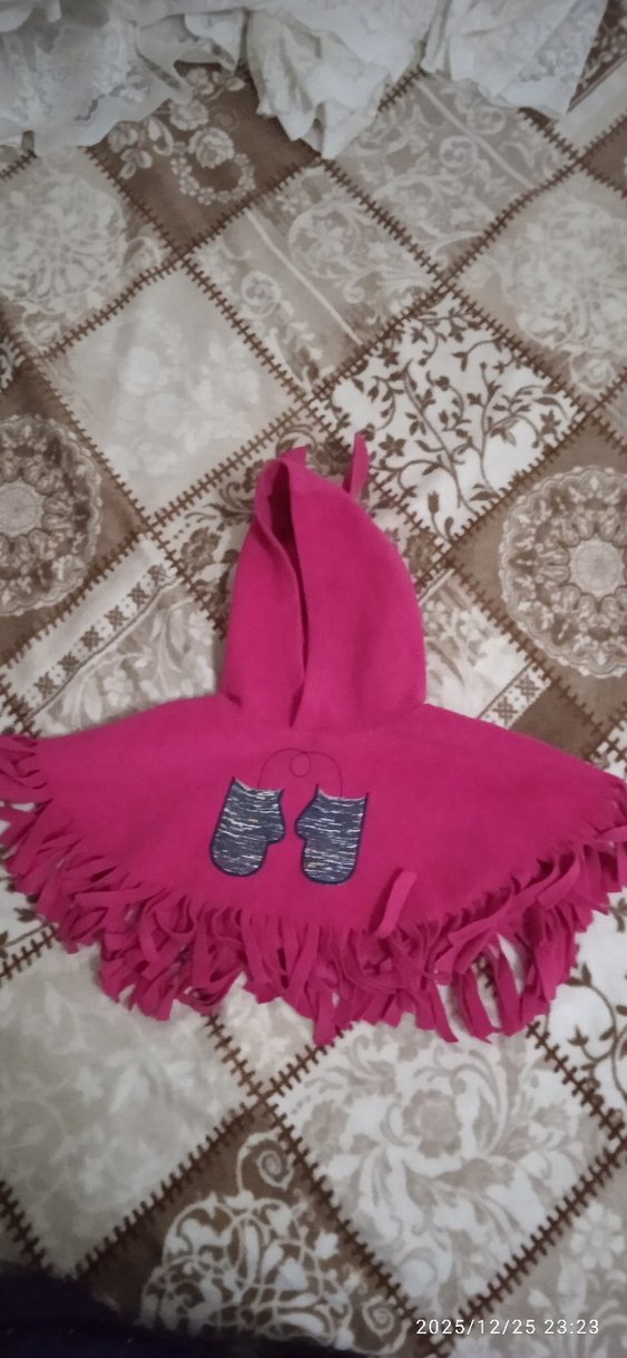 Kapüşonlu, renkli nakışlı, örme yumuşak polar kumaştan yapılmış, püsküllü ve salaş kesim kız çocuk pançosu.