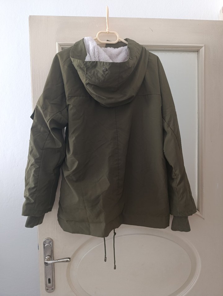 Yüksek yakalı, uzun kollu ve rahat kesimli kadın mont. Fermuarlı, sentetik kumaştan outdoor için uygun, kapüşonlu ve haki renkte. Eksikleri var fermuar ucu yok kapüşonl tüyü yok