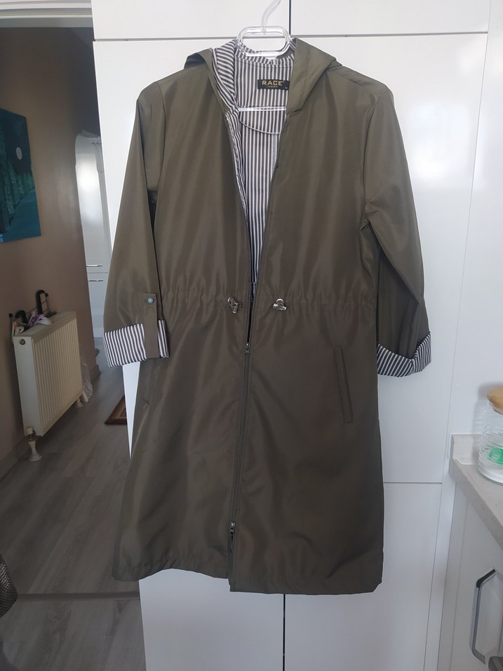 Kapüşonlu, fermuarlı ve uzun kollu bol kesim yağmurluk. Sentetik kumaştan, çizgili iç astarlı ve günlük kullanıma uygun. çok özenli kullanılmış hiçbir kusuru yok yeni gibi