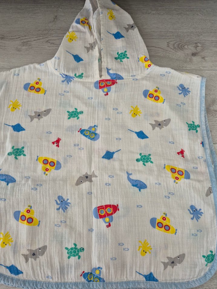 Kapüşonlu, deniz canlıları ve denizaltı desenleriyle renkli erkek çocuk bornozu. Yumuşak ve emici kumaştan üretilmiştir.