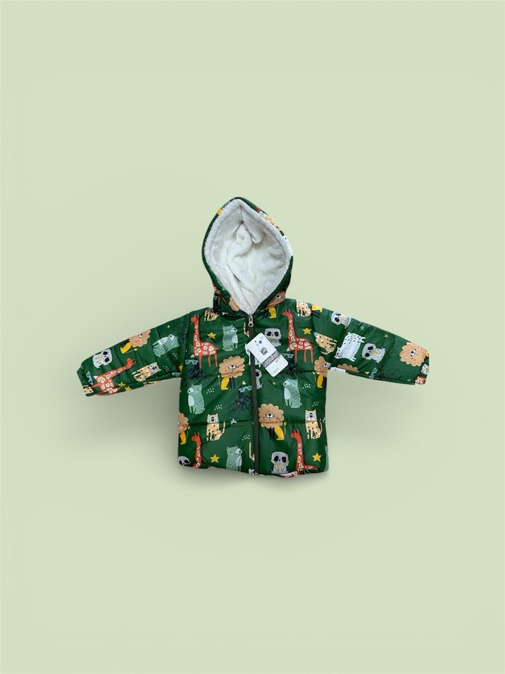 Kapüşonlu, renkli hayvan baskılı ve fermuarlı erkek çocuk ceketi. Rahat kesimi ve yumuşak, sıcak kumaşıyla gündelik kullanım için uygundur.