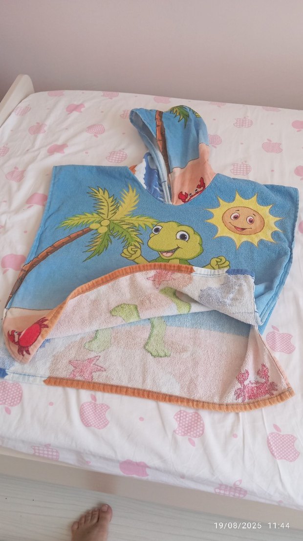 Kapüşonlu, renkli baskılı erkek çocuk bornozu; yumuşak, emici kumaştan yapılmıştır. Üzerinde kaplumbağa, palmiye ağacı ve güneş figürleri bulunur.