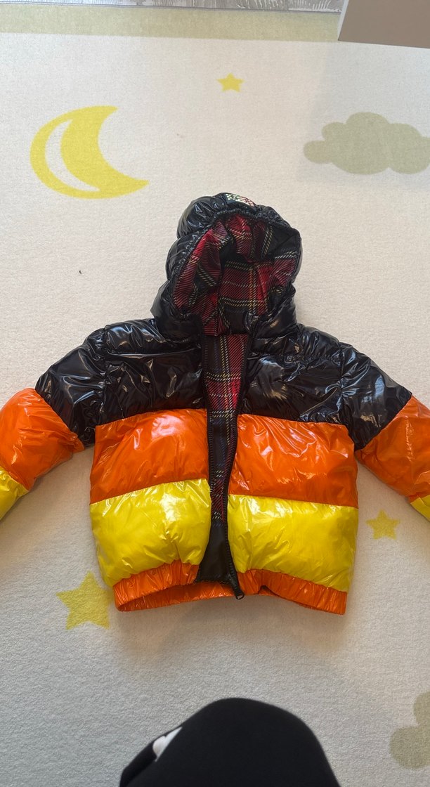 Kapüşonlu, kemerli detaylara sahip, yumuşak ve sıcak kumaştan yapılmış, çok renkli ve dar kesim erkek çocuk montu.