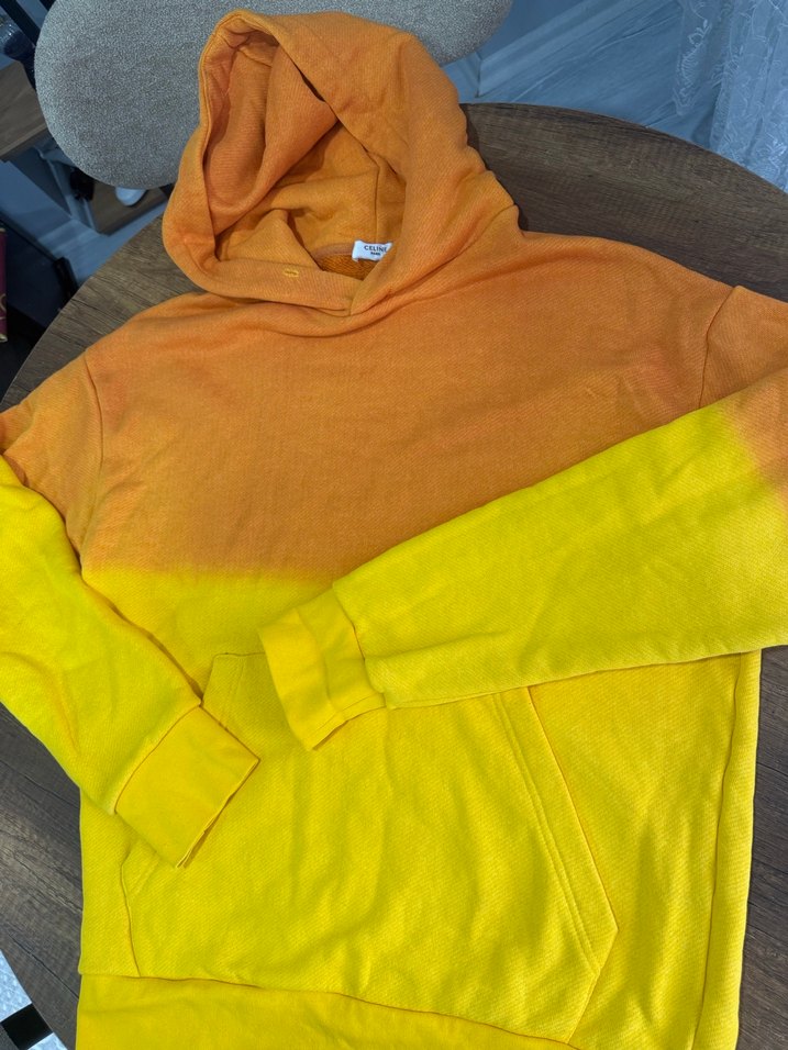 Kapüşonlu, uzun kollu ve bol kesim kadın sweatshirtü. Turuncu ve sarı renklerde renkli tie-dye deseniyle, yumuşak ve sıcak kumaştan üretilmiştir. Rahat ve şık bir görünüm sunar.