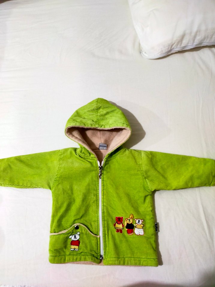 Kapüşonlu ve fermuarlı, yumuşak ve sıcak kumaştan yapılmış, renkli yeşil nakışlı kız erkek çocuk ceketi. Trendy günlük kullanım için uygundur.
