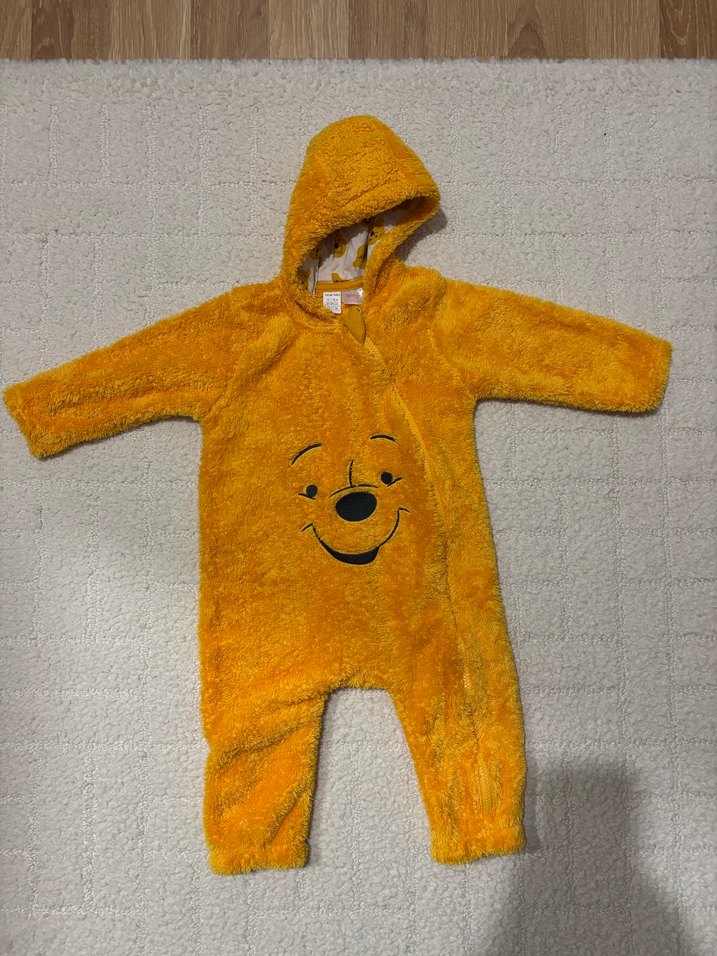 Kapüşonlu, yumuşak dokulu sarı erkek bebek tulumu, önünde gülen yüz baskısı bulunur. Soğuk havalar için sıcak tutar. ❄️