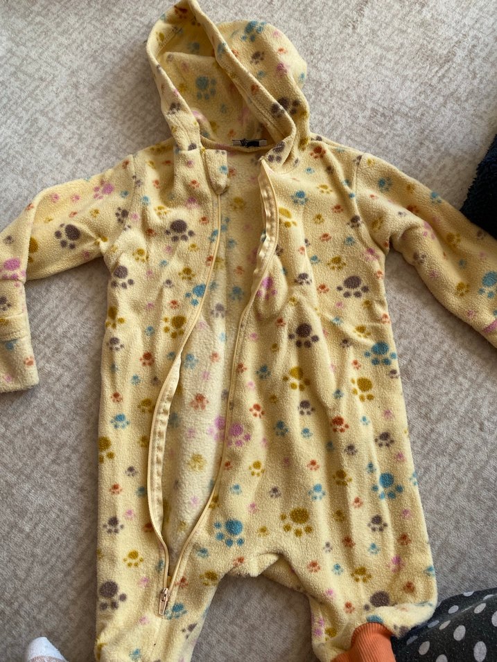 Kapüşonlu, sarı pastel tonlarda tie-dye desenli ve kürk detaylı bebek tulumu, sıcak tutar ve rahatlık sağlar. ❄️ oğluma giydirdm ben