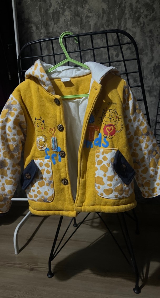 Kapüşonlu, düğmeli, bol kesim sarı ceketin üzerinde renkli baskılar ve cepler bulunur. Yumuşak, sıcak kumaştan üretilmiştir.