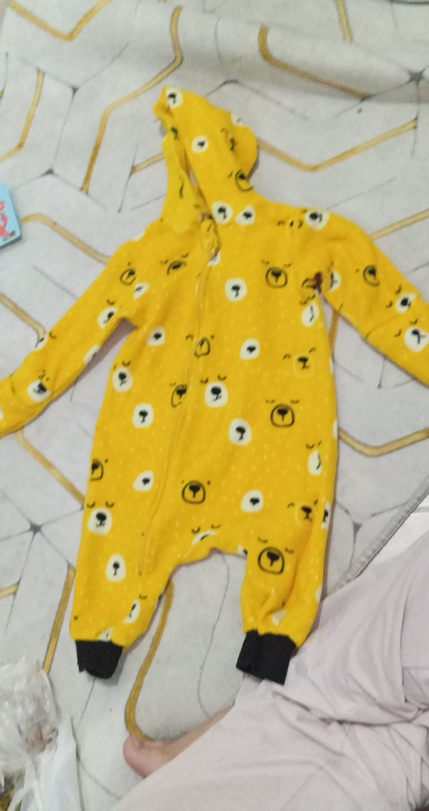 Kapüşonlu, uzun kollu sarı bebek tulumu, yumuşak ve sıcak kumaştan, renkli ayı desenleriyle. Örgü detaylı ve rahat kesim.