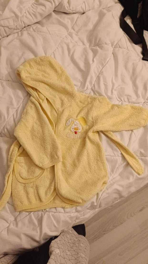 1 ve 1 buçuk yaş uyumlu çok az kullanıldı Pastel sarı renkte, kapüşonlu ve nakışlı tavşan desenli yumuşak kumaştan erkek çocuk bornozu.
