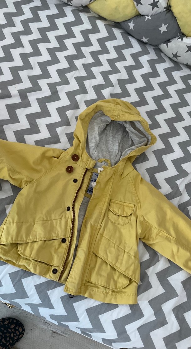 Sarı renkli, düğmeli ve kapüşonlu erkek çocuk kabanı. Bol kesim, çentikli yaka ve gri yumuşak astar içerir. Sokak modasına uygun sade tasarım.