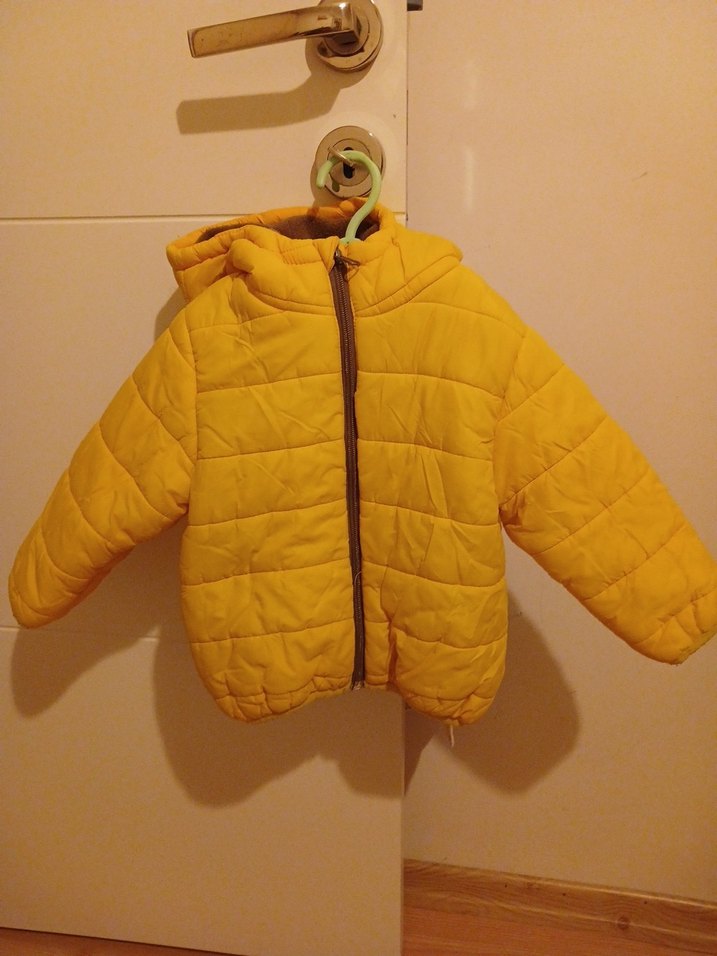 Kapüşonlu ve fermuarlı, sarı renkli, erkek çocuk montu. Yumuşak ve sıcak kumaştan, sade ve sokak tarzında.