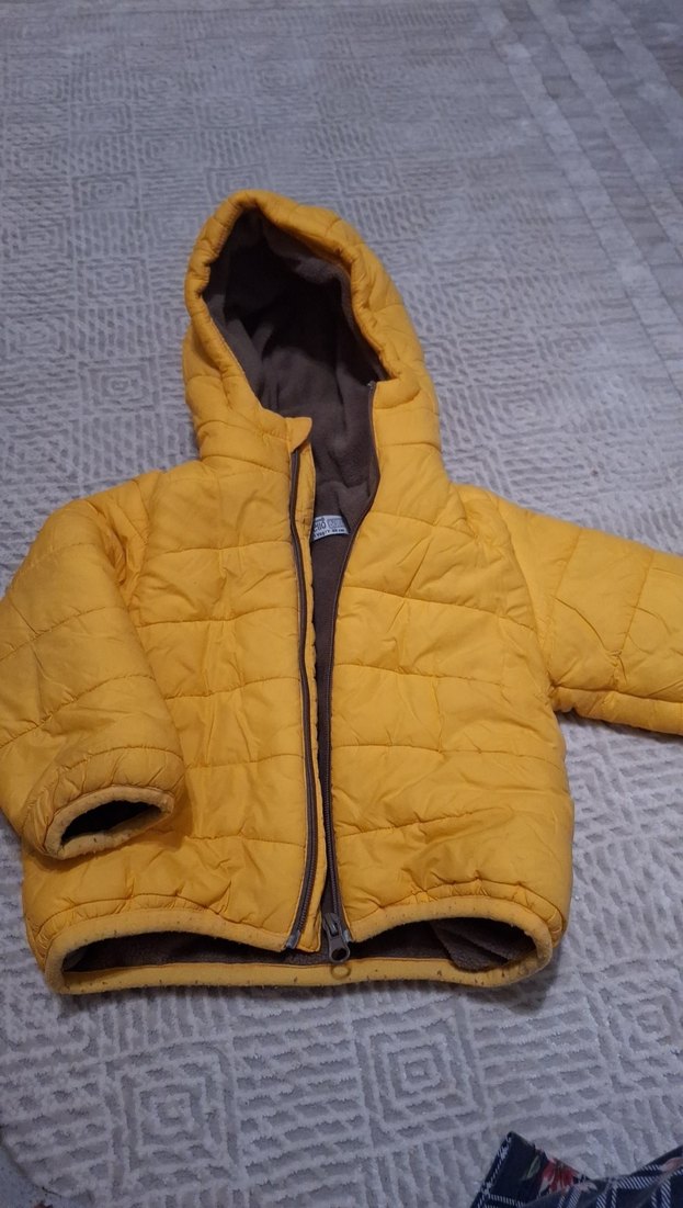 Kapüşonlu ve fermuarlı, yumuşak ve sıcak kumaştan yapılmış sarı erkek çocuk mont, sokak stili için uygundur.