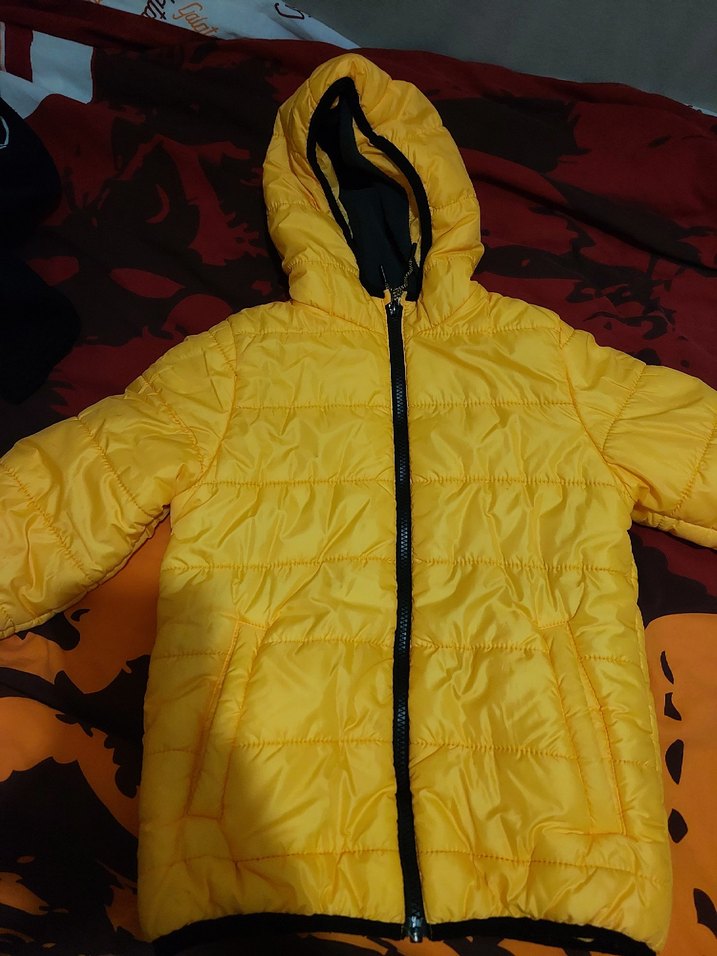 Sarı kapüşonlu erkek çocuk mont, fermuarlı ve vücuda oturan kesime sahip. Yumuşak ve sıcak dokulu kumaştan üretilmiş, renkli sokak stili için uygun. bir kolunda boya lekesi var oyüzden fiyatı uygun tutuyorum başka hiçbir sorunu yok 9 -10 yaş 134-140 cm
