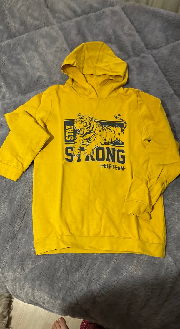 Kapüşonlu, uzun kollu, bol kesim sarı sweatshirt. Renkli kaplan baskısı .