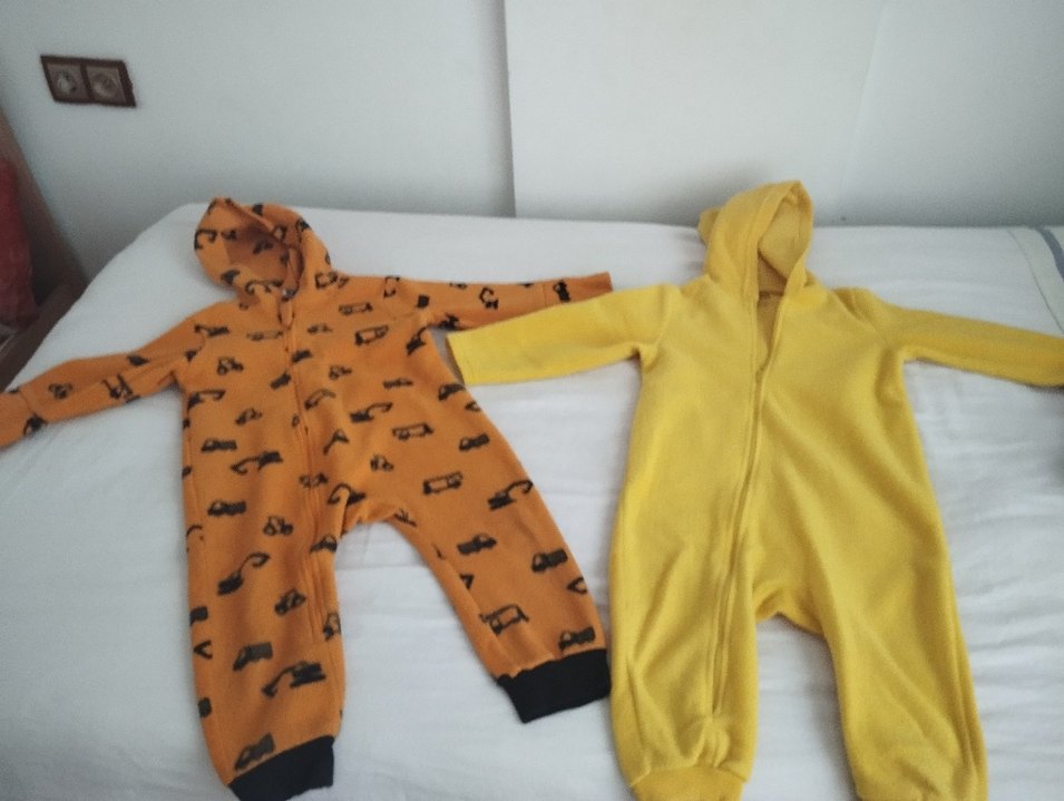 Kapüşonlu ve fermuarlı, uzun kollu sarı renkli yumuşak ve sıcak kumaştan bebek tulumu. Street wear tarzında.2adet fiyatıdır