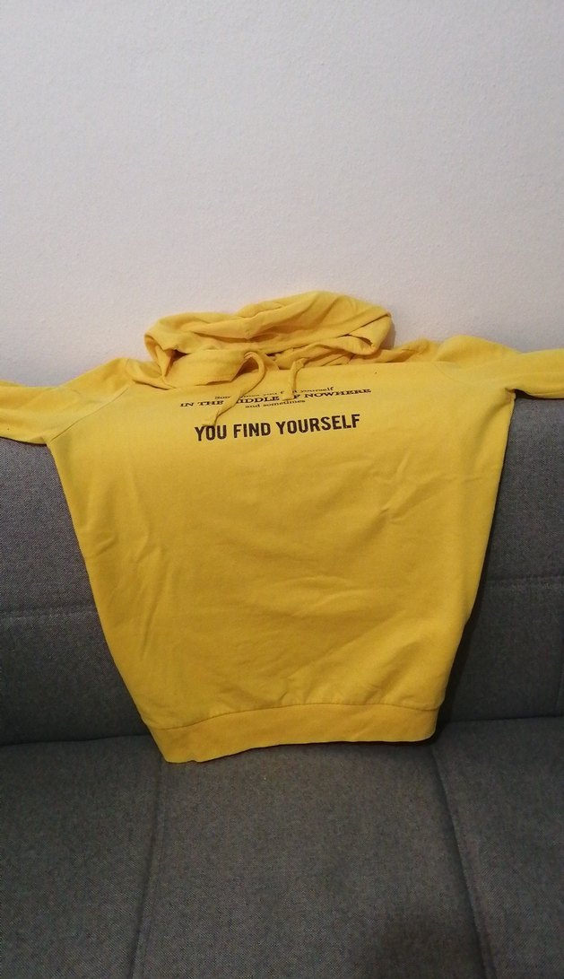 Uzun kollu, kapüşonlu ve bol kesim sarı sweatshirt üzerinde "YOU FIND YOURSELF" yazısı bulunur. Yumuşak ve sıcak kumaştan üretilmiştir.