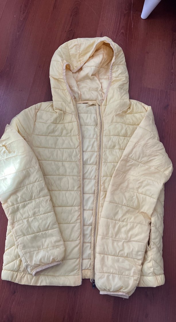Fermuarlı, kapüşonlu ve notched yakalı sarı kadın mont. Fermuar kısmı yapılması gerek. Yumuşak sentetik kumaştan, uzun kollu, midi boyda ve günlük kullanıma uygun rahat bir modeldir.