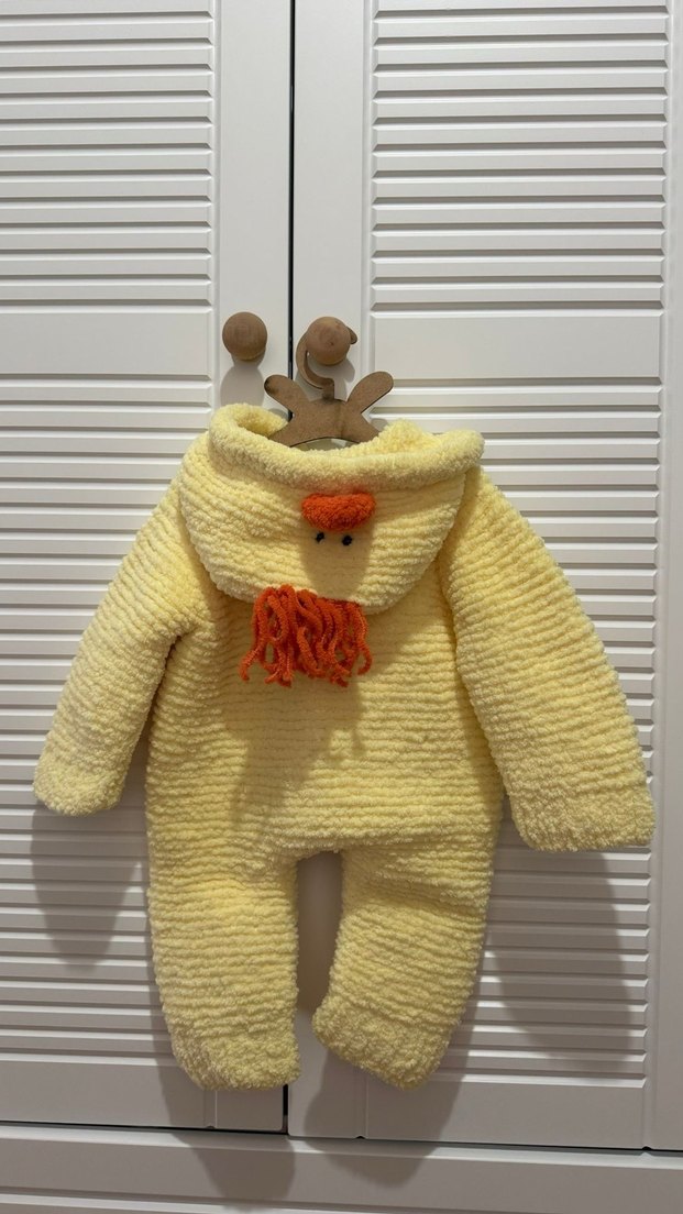Kapüşonlu, örgü sarı bebek tulumu, renkli ördek detaylı, sıcak ve rahat tutar.