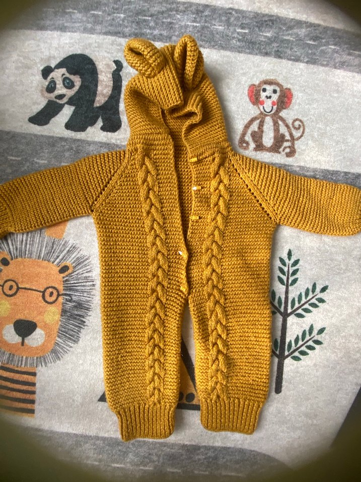 Sarı renkli, kapüşonlu ve uzun kollu örgü bebek tulumu. Önden kablo örgü detaylarıyla bohem tarzda, rahat bir tasarıma sahiptir.