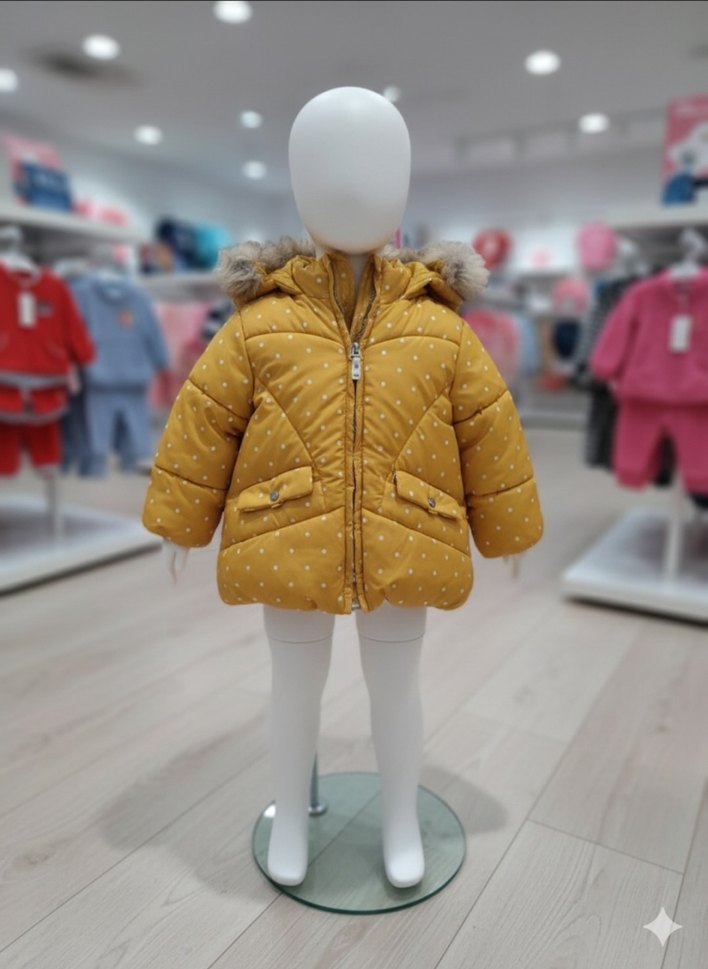 Kapüşonlu, kürklü, sarı puantiyeli, yumuşak ve sıcak kumaştan yapılmış, trend sokak stili için uygun kız çocuk montu.