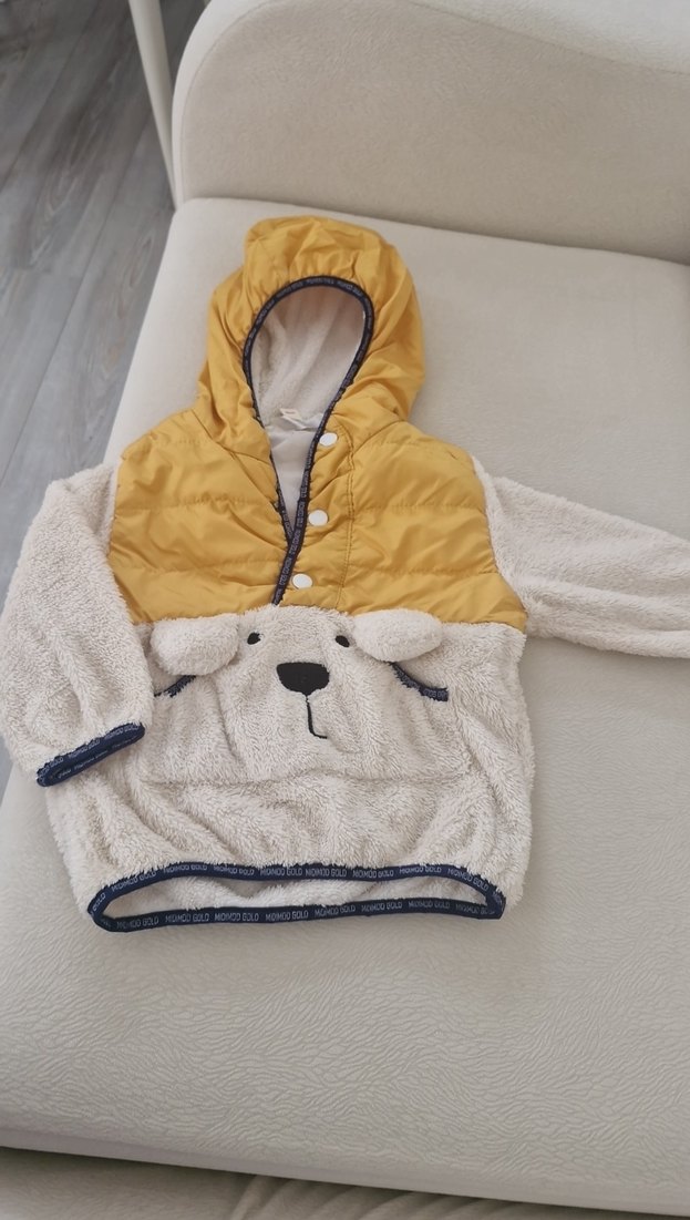 Kapüşonlu, bol kesim erkek çocuk montu sarı üst ve yumuşak kumaş kombinasyonuyla. Baskılı hayvan yüzü ve kürk detaylı kollar içerir.