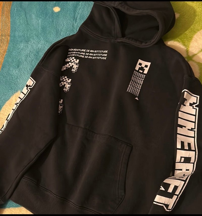 Siyah kapüşonlu, minecraft baskılı, uzun kollu, bol kesim ve fermuarlı detaylara sahip sweatshirt. Yumuşak ve sıcak kumaştan üretilmiştir. Boyu 58, eni 55cm . İçi şardonlu kalın üründür