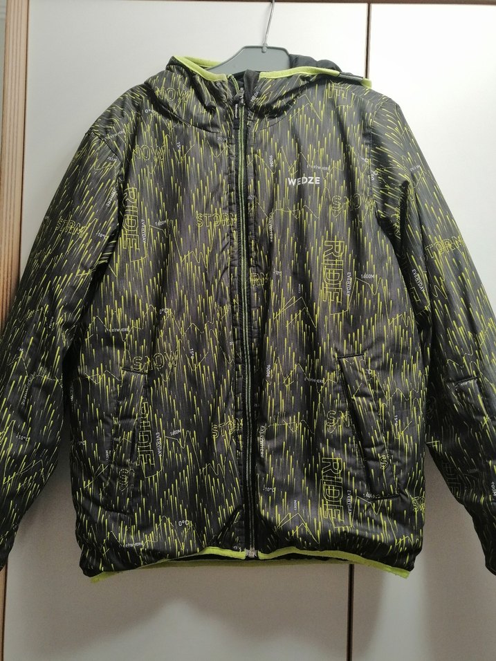 Çift taraflı kullanılabilir. Bu siyah baskılı erkek mont, kapüşonlu ve fermuarlı olup, bol kesimdir. Suni kumaştan üretilmiş, sokak stiline uygundur.