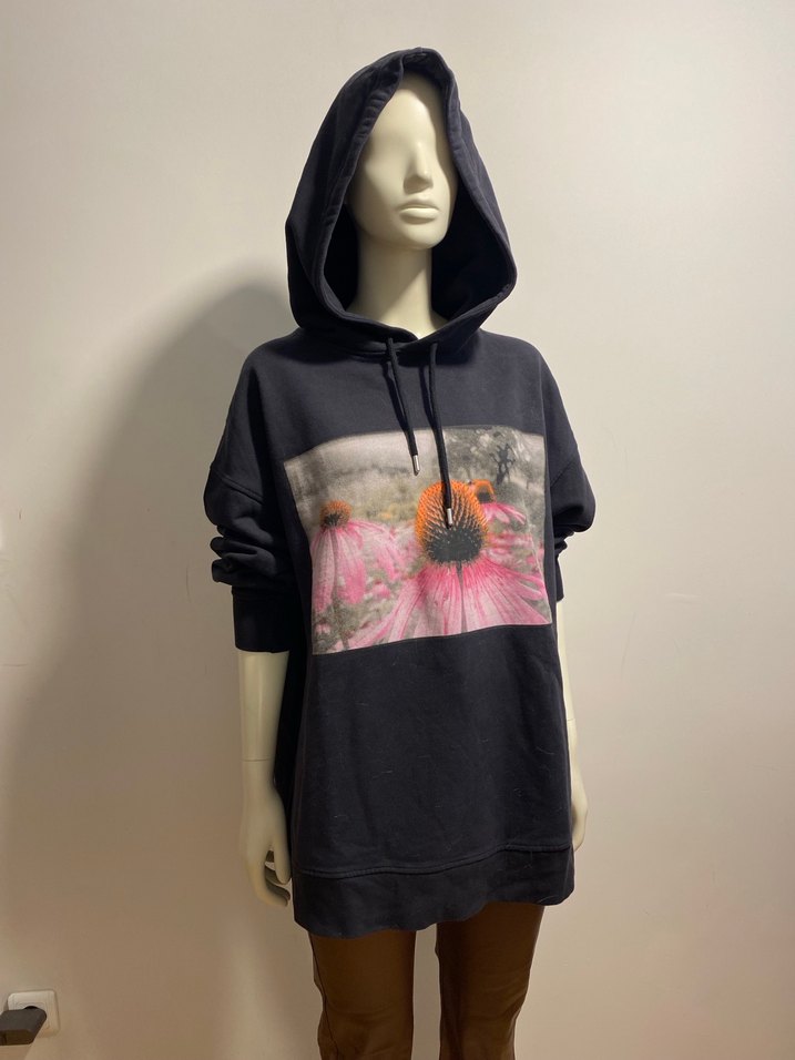 Yumuşak fleece kumaştan, kapüşonlu ve bol kesim uzun kollu siyah sweatshirt. Önde çiçek baskısı ve örme detaylarıyla günlük kullanıma uygun.