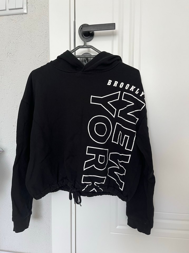 Siyah kapüşonlu sweatshirt, uzun kollu ve bol kesimdir. "New York Brooklyn" baskılı, fermuarlı detaylı ve bağcıklı alt kısmı vardır. Yumuşak, sıcak kumaştan üretilmiştir. Xs bedene uygundur
