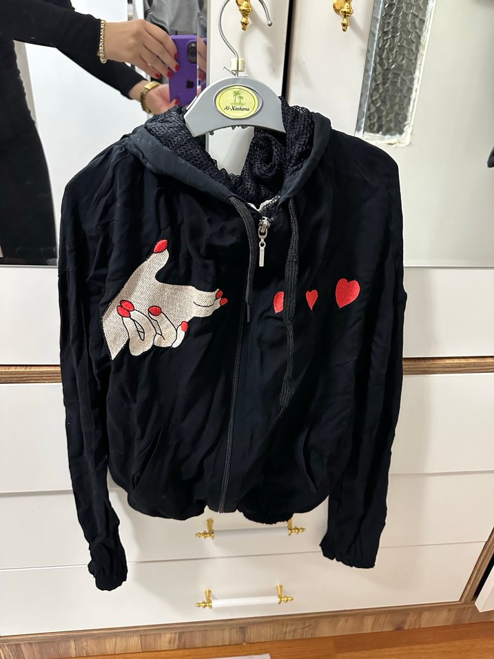 Kapüşonlu, fermuarlı siyah mini ceket. Uzun kollu ve bol kesimdir, yumuşak kumaştan yapılmıştır. Üzerinde el ve kalp baskısı bulunur.