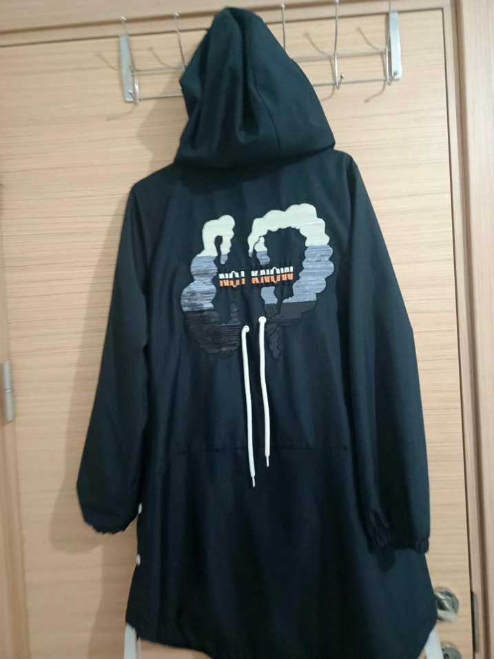 Siyah kapüşonlu mont, uzun kollu ve bol kesimdir. Yumuşak ve sıcak kumaştan üretilmiş, önünde baskı ve ayarlanabilir bel bağı bulunur. yağmurluk 38 40 beden uyumlu