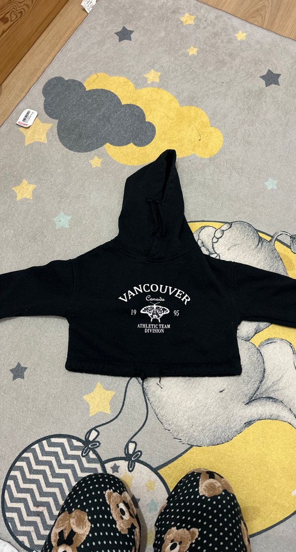 Siyah kapüşonlu sweatshirt, Vancouver baskılı, uzun kollu ve kısa kesim. Yumuşak kumaştan, rahat dış mekan kullanımı için uygundur.