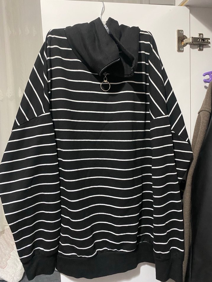 Siyah renkte, beyaz yatay çizgilerle desenlenmiş, kapüşonlu ve fermuarlı, bol kesim uzun kollu sweatshirt. Günlük kullanım için uygundur.