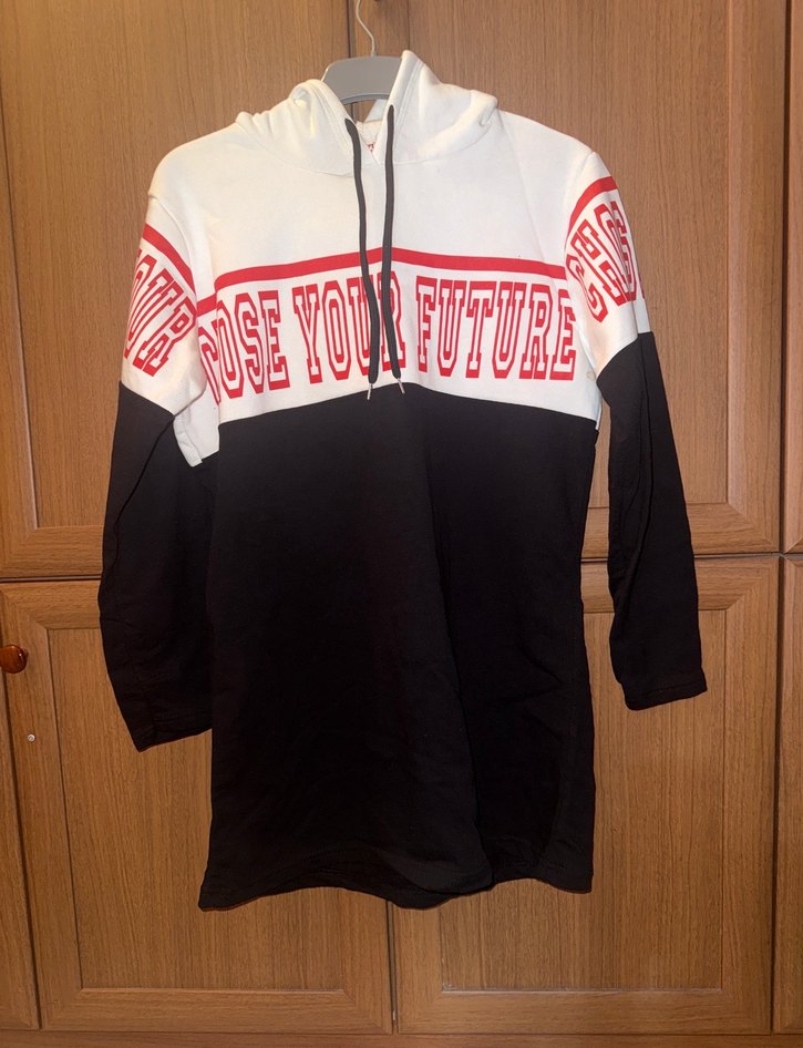 Sıfır, hiç kullanılmamış üründür. Kapüşonlu, uzun kollu, bol kesim siyah-beyaz kadın sweatshirt. Üzerinde yazı baskısı bulunur. Pamuklu kışlık kumaştan yapılmıştır.