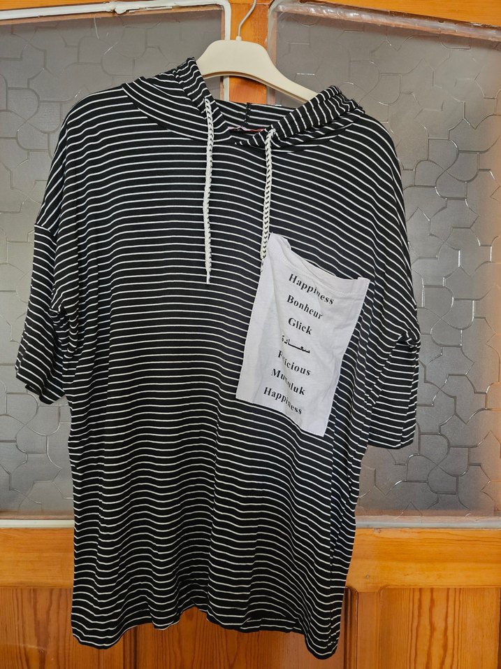 Kapüşonlu, kısa kollu, siyah-beyaz çizgili ve baskılı beyaz patch detaylı, rahat kesim kadın sweatshirtü. Yumuşak kumaştan üretilmiştir.