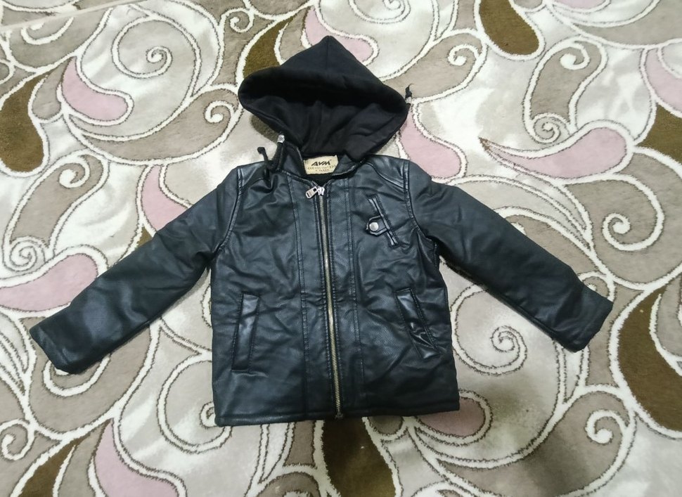 Erkek çocuklar için kapüşonlu, fermuarlı siyah deri biker ceket. Düz ve şık tasarıma sahip, rahat ve trend bir model.