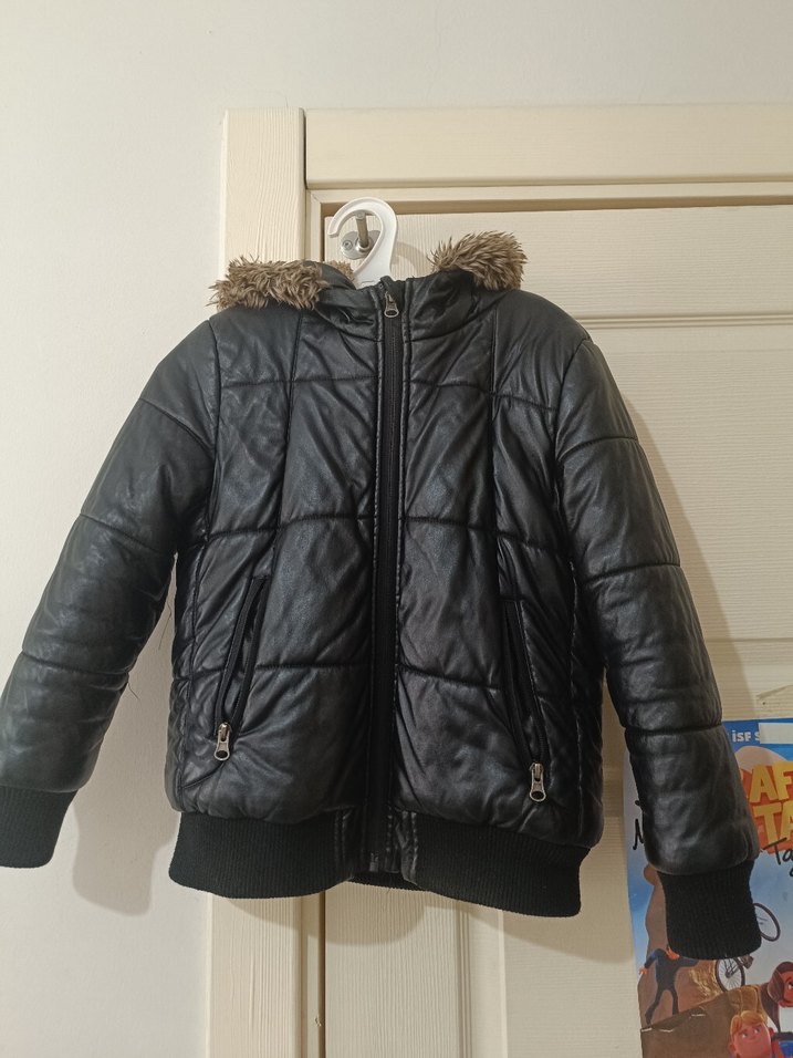 Kapüşonlu, kürklü detaylara sahip siyah deri erkek çocuk mont, gotik ve rock punk tarzını yansıtıyor. sadece fermuarinin üstündeki yerde hafif soyulma var başka sorunu yok
