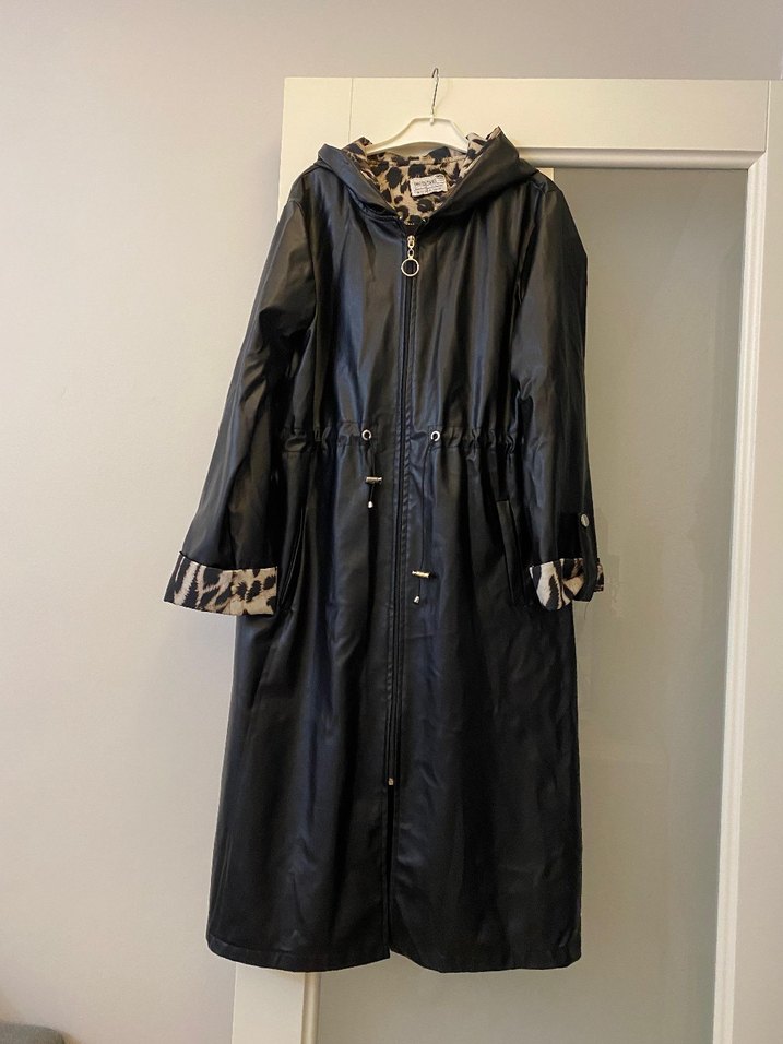 Kapüşonlu, bol kesim siyah deri uzun yağmurluk, leopar desenli kürk detaylarıyla sokak stiline uygun.1 kere giyildi sıfırdan farksız.42 beden e uyumludur.