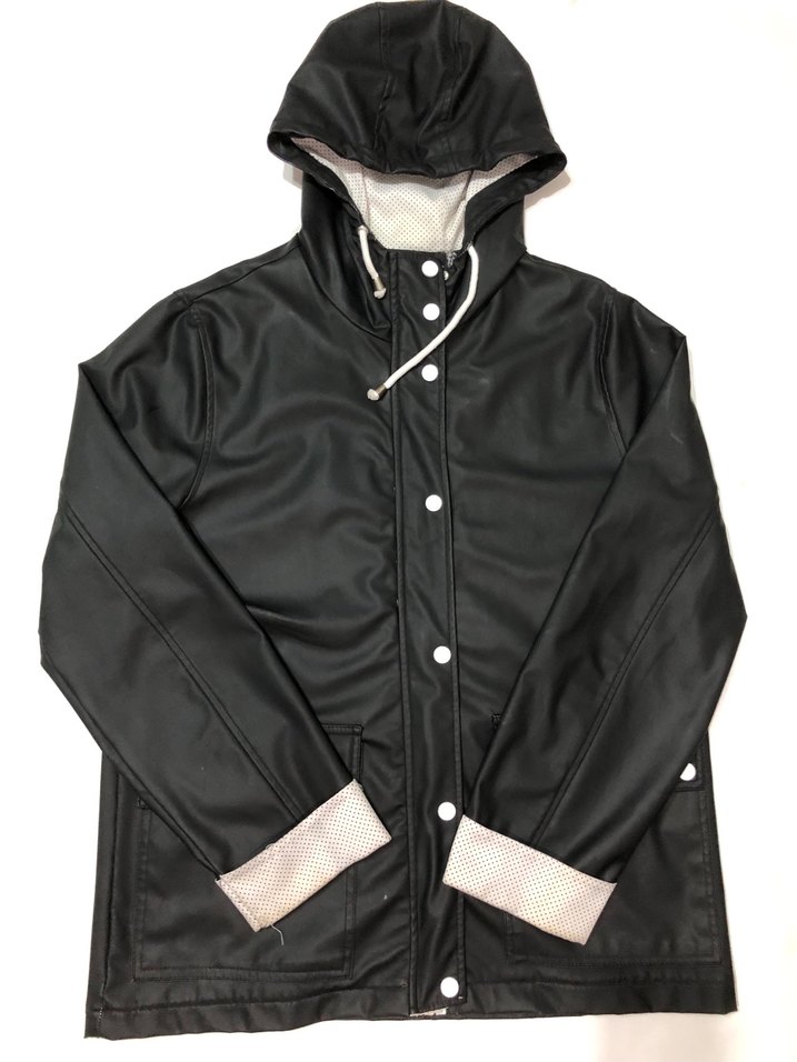 Bu siyah deri unisex yağmurluk, kapüşonlu ve düğmeli olup uzun kolludur. Normal kesim ve midi boydadır, günlük sokak stili için uygundur. ️